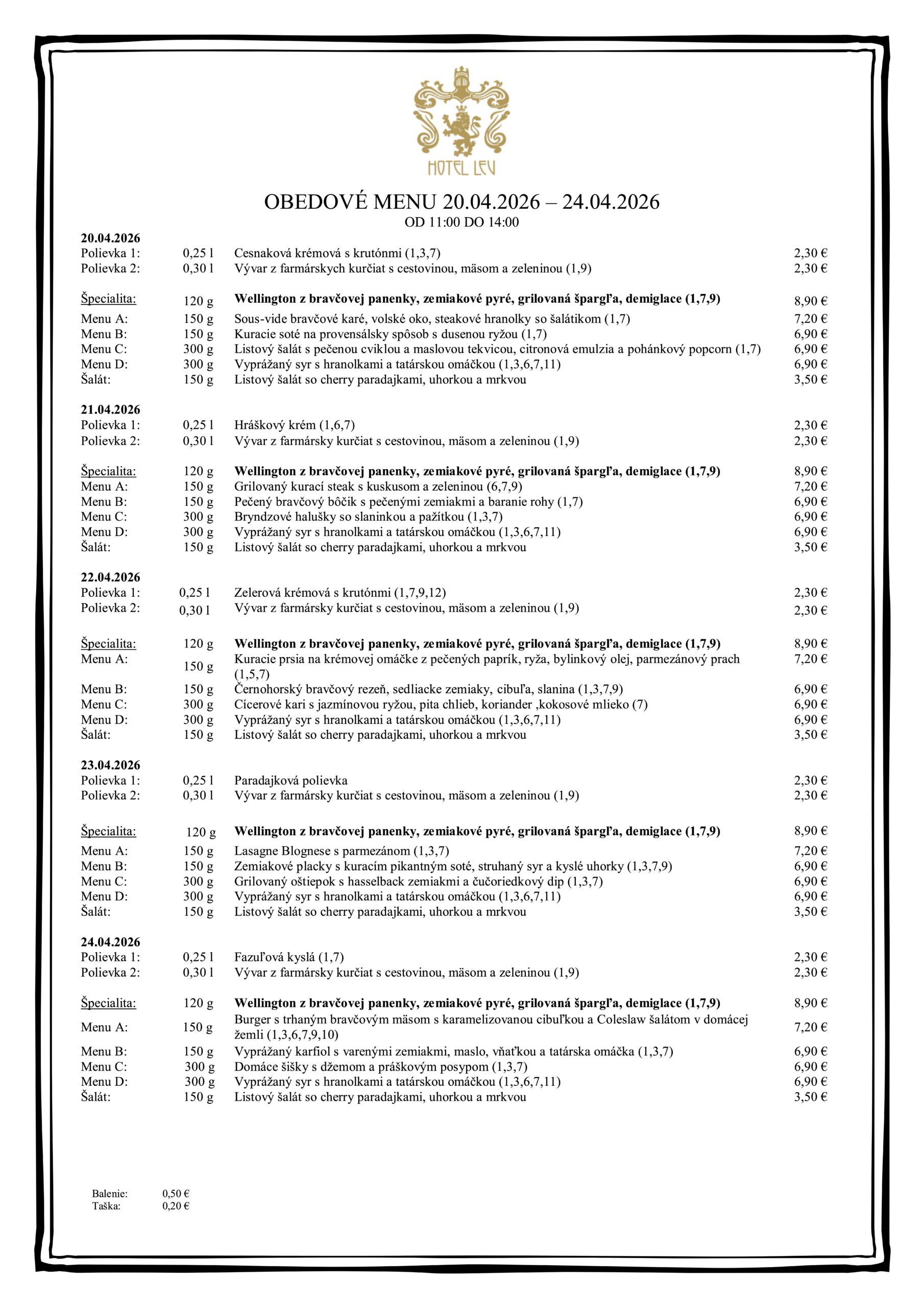 Menu D:     300 g     Domáce langoše so smotanou, syrom, cesnakom a tatárskou omáčkou (1,3,7)   5,90 €